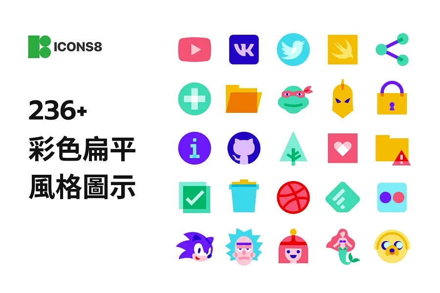 這一套彩色玻璃風格(Color Glass Style) 的 Icon 是 Icons8 精心挑選扁平化 Icon ,特色是有鮮豔、飽和的色彩,很適合用來裝飾你的任何設計,尤其是網站和平面設計專案中。這一組免費 Icon 還包括可愛的彩色 Icon、表情符號 Icon、手繪風格 Icon 等等,可以幫你用簡單有效的方式凸顯自己!